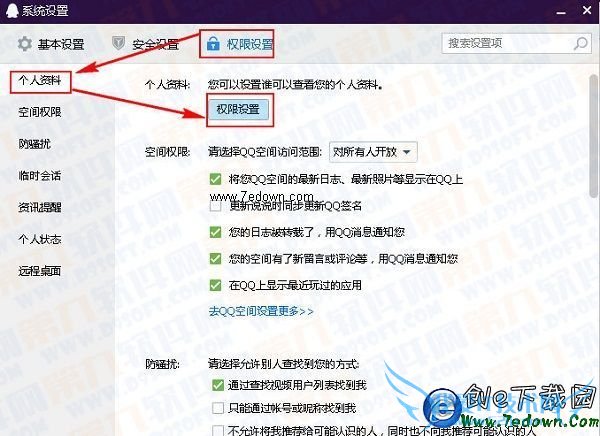 2、进入系统设置依次点击“权限设置”—“个人资料”-“权限设置”。