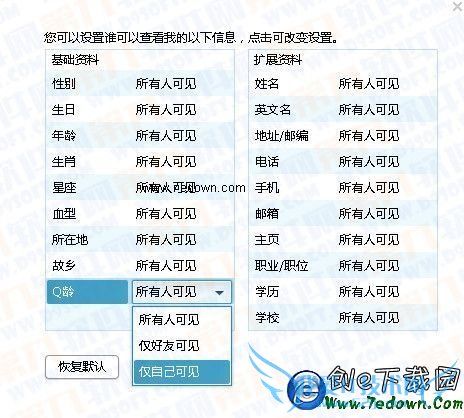 3、找到“Q龄”,点击所有人可见下拉框,选中“仅自己可见”即可。