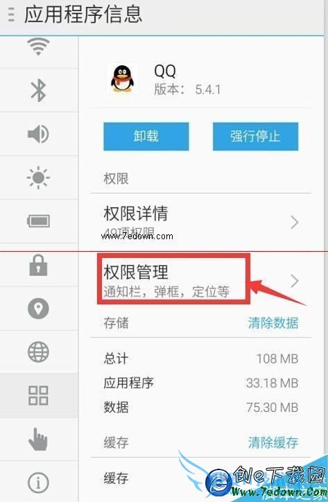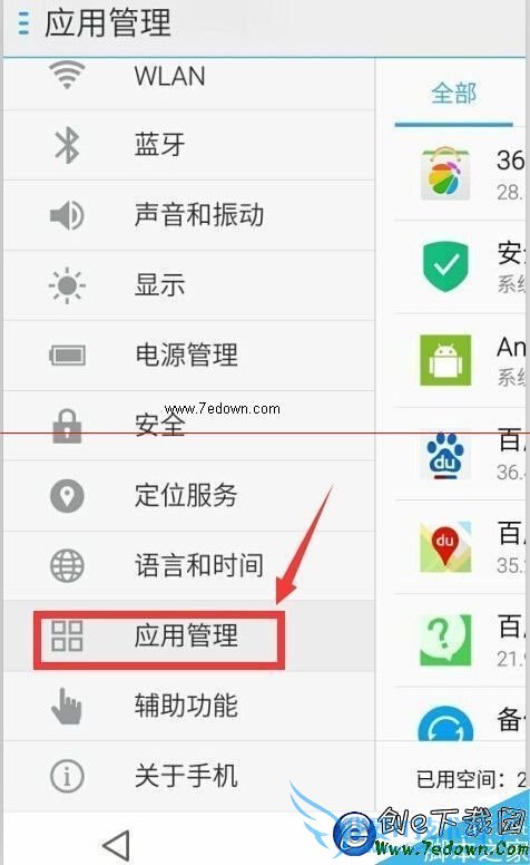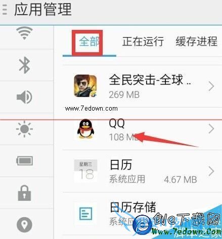 2、在设置窗口中,选择左侧导航中的“应用管理”。然后右侧全部应用中找到:QQ并点击进入;