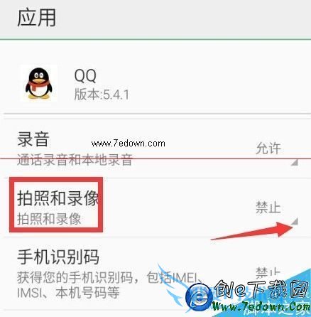 4、下拉选项直到“拍照和录像”,此时状态为禁止。点击右下黑色三角下拉菜单,选择“允许”状态。