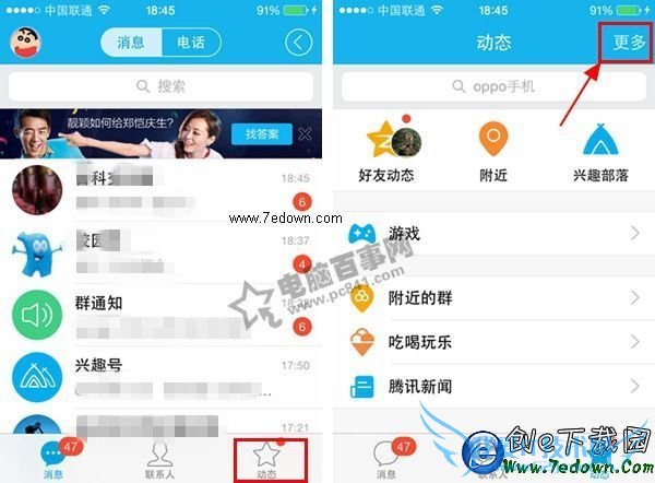 1,由于手机QQ健康不是直接的功能,需要进行添加该项功能,进入到手机QQ动态,点击“更多”,如下图所示: