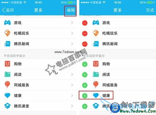 2,点击“”编辑添加健康,使得该功能在动态显示,如下图所示: