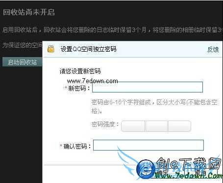 2、如果空间还没有设置密码的朋友,点击“日志”,弹出的页面提示你开启回收站功能,开启回收站后,你删除的邮件,QQ空间将为你保存三个月。或者直接输入你的QQ空间密码。我们点“启动回收站”,弹出对话框要我们设置密码。我们输俩遍后,点确定。但是这密码不能和QQ密码相同。
