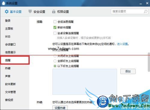 3、再点击左侧栏从登录设置切换到“提醒”设置;