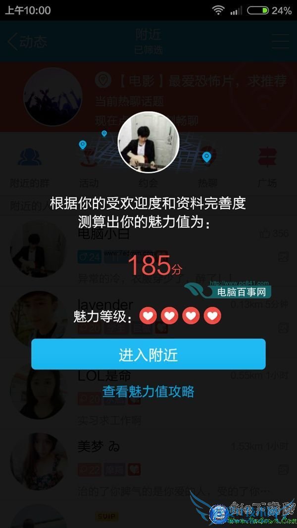 当我们更新手机QQ最新版之后,第一次进入到附近,系统会自动根据你的受欢迎程度和资料完善度测算出你的魅力值分数,然后会以魅力等级的形式展示出来,魅力值只有达到了四心或以上的用户,将在附近列表展示魅力勋章。