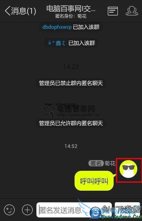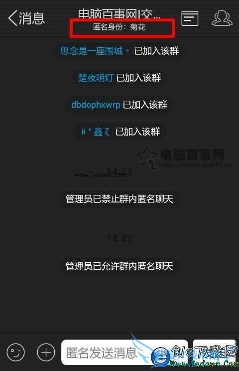 3,此时可以看到一个“匿名”选项图标,点击后就可以在群内发送匿名消息了,系统自动给分配了一个名为“菊花”的匿名身份,如下图。