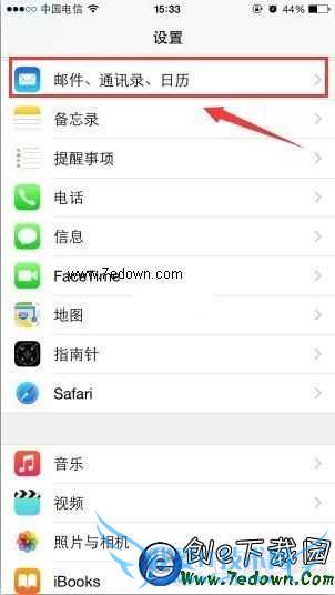 1,打开设置→下拉找到邮件、通讯录、日历选项,如图所示:
