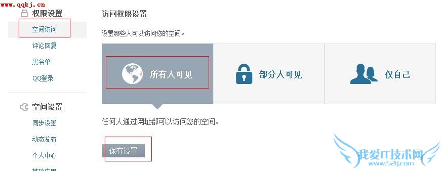 然后点空间访问,再点所有人可见,最后点保存设置,如下图:
