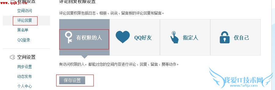 操作也是先进入个人中心,然后点空间设置,再点评论回复>有权限的人>保存设置,如下图: