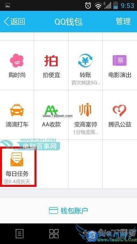2、在手机QQ钱包里面,找到每日任务便可找到QQ钱包签到位置了,如下图所示: