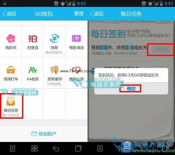 在手机QQ钱包里面,找到每日任务,进入到每日任务界面便可看到每日签到字样,点击“签到”即可,完成之后会弹出“签到成功,获得0.2天等级成长天”,最后点击确定完成签到,如下图所示: