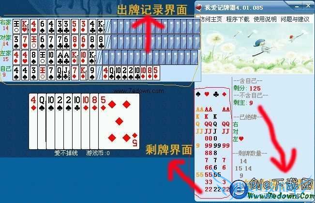 剩牌界面(主界面):统计其他玩家手中的牌型(除去自己手中的牌和大家出过的牌,以及你能看到的牌),这样你就知道外面还有些什么牌了。大王用Z表示,小王用F表示。