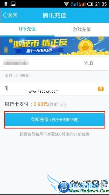 5、进入Q币充值页面之后,填写好充值数量后,点击【 立即充值 】