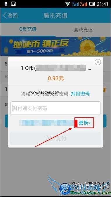 6、已经添加过银行卡、和财付通的用户,需要在弹出收银台后,先点击【 更换 】支付方式。