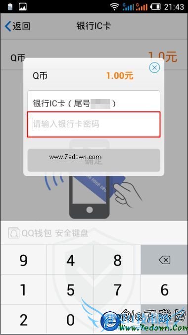 9、待手机QQ读取到IC卡之后,就会弹出银行IC卡的收银台页面了。此时再输入银行卡支付密码点击确定即可完成支付了。