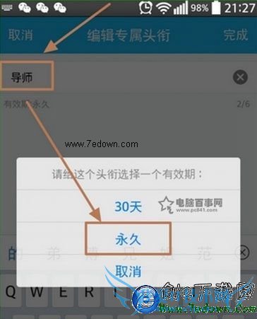 8、点击完成弹出选择这个QQ群专属头衔的有效期。据个人意愿选择。