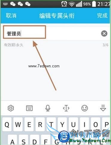7、进入编辑专属头衔界面,可以将原来的头衔删除。重新输入任意6个中文字以内的专属头衔。