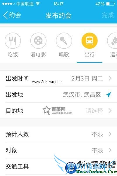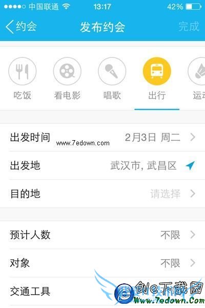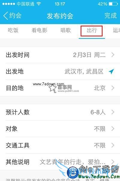 6,最后我们找到【同行】,在其下方填写相关信息,发布约会时填写内容包括:出发时间、目的地、交通工具、预计人数、对象、同行说明。如下图所示: