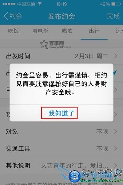 7,最后点击一下【完成】,会弹出一个提醒框“约会容易,出行需谨慎。相约见面要注意保护好自己的人身财产安全哦”,点击一下我知道了,如下图