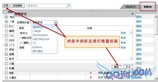 使用WebQQ还可以批量的删除好友,如图05所示。其使用方法与“批量移动好友”类似,值得一提的是,经过“批量删除”的好友,都被放到了“回收站”中,此后你还可以通过“回收站”对删除的好友进行“还原”和“彻底删除”操作。