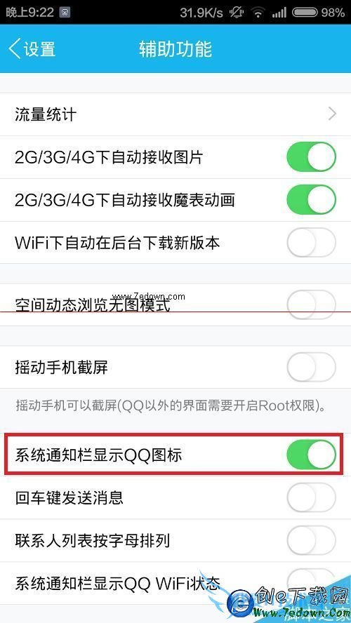 6、将“系统通知栏显示QQ图标”开关打开。这样就能显示QQ图标了。