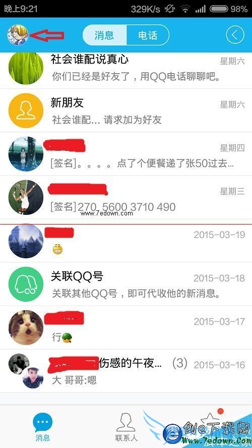 3、QQ程序设置:登录QQ,在消息界面点击自己的头像。