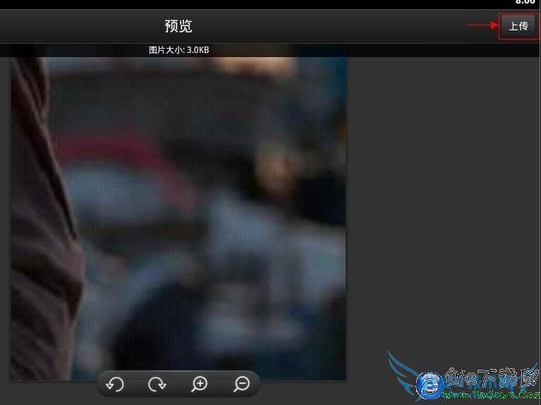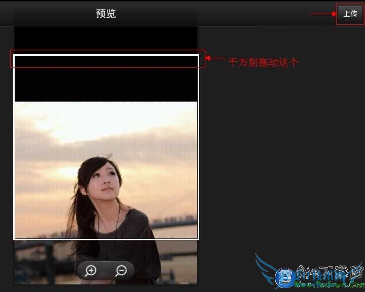 第五步:选中了图片之后,手机qq软件会预览一下图片并允许你上下左右调节。默认状态下请不要进行任何拖动操作,直接点“上传”就行,否则图片会错位。