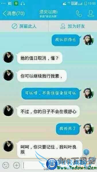 作为天天没事吹牛装逼的玩家,自然知道装逼界曾出现过两位顶级传说人物,一位是“(轩辕)龙傲天”,主角光环,家势深厚,王者之风,霸气侧漏,各路美女投怀送抱,碾谁谁就死,瞪谁谁怀孕;另一位则是“赵日天”,对谁都不服,干谁谁必死。而今,江湖上终于出现了第三位装逼王者——叶良辰!和前面两位不同的是,这次的“叶良辰”小哥并非出现在虚构的小说里,而是生活在现实中。这两天一个叫“叶良辰”的小哥在微博火了,想必大家还不清楚源自哪里,小编今天就给大家科普一下。事情起因是北京某高校女寝,因为打扫卫生问题,其中一女生请来了一位名叫“叶良辰”的大哥,于是和该寝室的寝室长展开了一段充满“魔性”的对话。叶良辰说:“你只需要记住,我叫叶良辰,在本地我有一百种方法让你活不下去,如果你想试试,良辰不妨陪你玩玩儿!”其实,良辰本是一个心疼女友但却玛丽苏文看多了的少年。恍恍惚惚就红了,不过男生就别看言情玛丽苏小说了,好吗?答应我!
