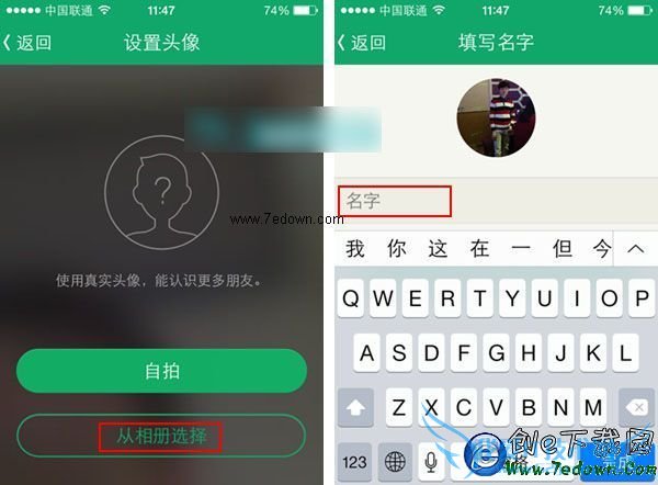 五,再接下来,就是设置自己的头像,可以自拍也可以从相册里面找到,随后进行名字设置,如下图所示: