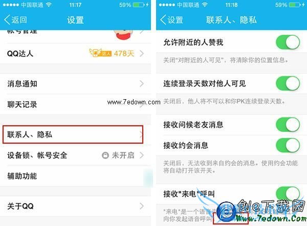二,进入到设置界面之后,在其下方找到并点击“联系人,隐私”一栏,进来之后在其下方找到“接收来电呼叫”,点击一下“了解详情”如下图所示: