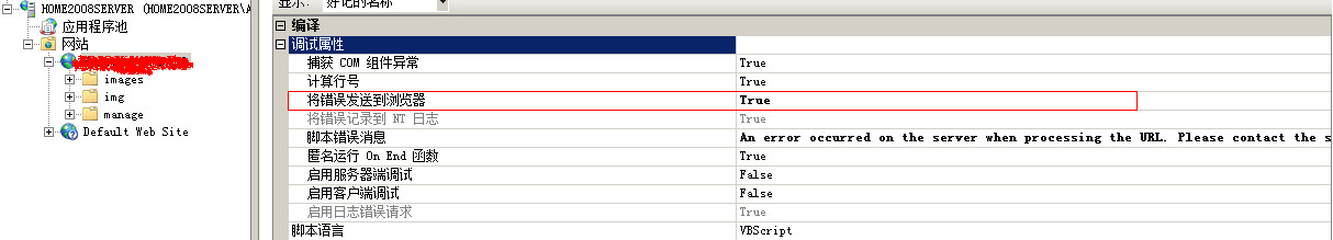 1. <网站>-ASP-调试属性-将错误发送到浏览器,修改为True