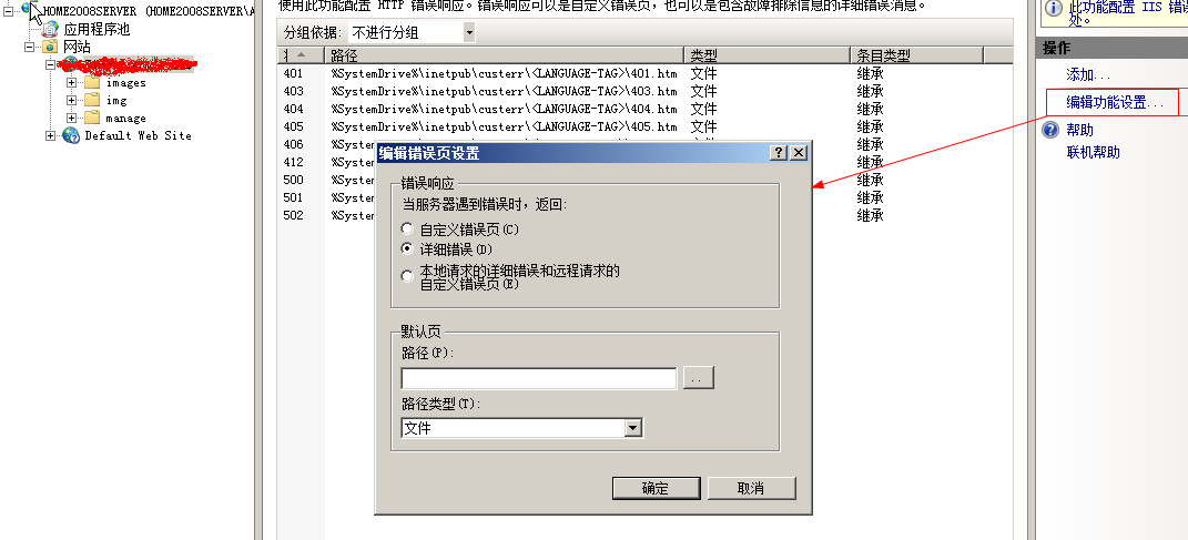 2. <网站>-错误页-操作-编辑功能设置,选择“详细错误信息”