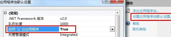 2、在出现的窗口中点击“设置应用程序池默认设置”链接,在弹出的窗口中将“常规”中的“启用32位应用程序”设置为“True”即可