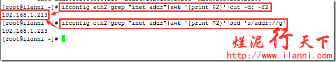 ifconfig eth0|grep "inet addr"|awk '{print $2}'|cut -d: -f2