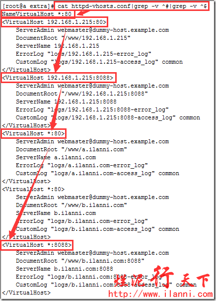 以上我们介绍了apache基于IP、基于端口和基于域名的虚拟主机配置。下面我们给出apache混合虚拟主机配置,配置文件如下: