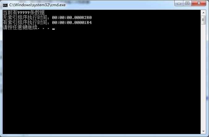Console.WriteLine("有索引排序执行时间:" + watch2.Elapsed);