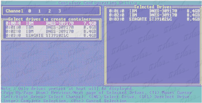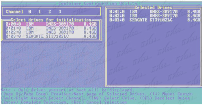 第3步,选择“Initialize Drivers“选项去对新的或是需要重新创建容器的硬盘进行初始化(注意: 初始话硬盘将删去当前硬盘上的所有数据),按回车后进入如(图4)所示界面。在这个界面中出现了RAID卡的通道和连接到该通道上的硬盘,使用“Insert”键选中需要被初始化的硬盘(具体的使用方法参见界面底部的提示,下同)。