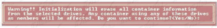 第9步,选中需要初始化的逻辑磁盘,按空格,弹出一个询问对话框,如(图20)所示。选中“YES”,并按回车键,弹出初始化进程(注意,初始化磁盘化损坏磁盘中的原有数据,需事先作好备份)。