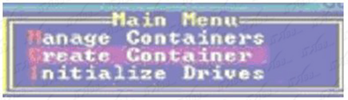 第5步,按“Y”键确认即可,进入如(图6)所示配置主菜单(Main Menu)界面。硬盘初始化后就可以根据您的需要,创建相应阵列级别(RAID1,RAID0等)的容器了。这里我们以RAID5为例进行说明。在主菜单界面中选择“Create container”选项。