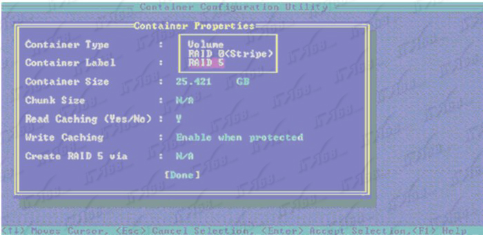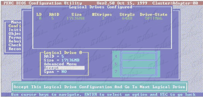 第7步,按“F10”键配置逻辑磁盘。选择合适的RAID类型,其余接受默认值。选中“Accept”,并按回车键确认,即弹出如(图18)所示的最终配置信息提示框。