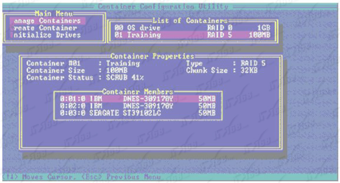 第8步,单击回车后返回到如(图6)所示主菜单配置界面,选中“Manage containers”选项,单击回车后即弹出当前的容器配置状态,如(图10)所示。选中相应的容器,检查这个容器的“Container Status”选项中的“Scrub”进程百分比。当它变为“Ok”后,这个新创建的Container便具有了冗余功能。