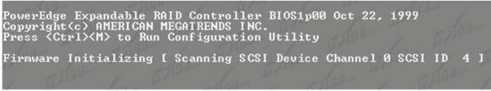 如果您的DELL服务器配置的是一块AMI/LSI磁盘阵列控制器(PERC2/SC、PERC2/DC、PERC3/SC、PERC3/DC、PERC4/DI和PERC4/DC),则在系统开机自检的时候将看到以下信息: