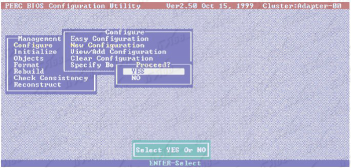 第3步,如果需要重新配置一个RAID,请选中“New Configuration”;如果已经存在一个可以使用的逻辑磁盘,请选中“View/Add Configuration”,并按回车键。在此,我们以新建磁盘阵列为例进行介绍。选择“New Configuration”选项。按回车键后,弹出一个小对话框,如(图15)所示。