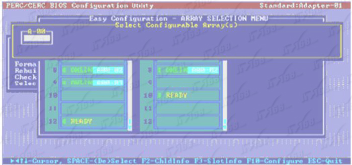 第5步,如果您的服务器中的阵列卡类型是PERC4 DI/DC,此时在回车后,将显示如(图17)所示配置界面,否则请直接赶往第7步。