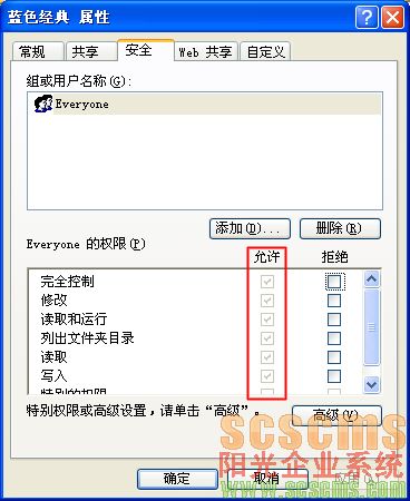 第二:在网站所在的文件夹上点右键,选择“属性”-->安全,给Everyone或者Users(根据系统不同选择)完全控制的权限,也就是在允许下面全打上√,然后确定。