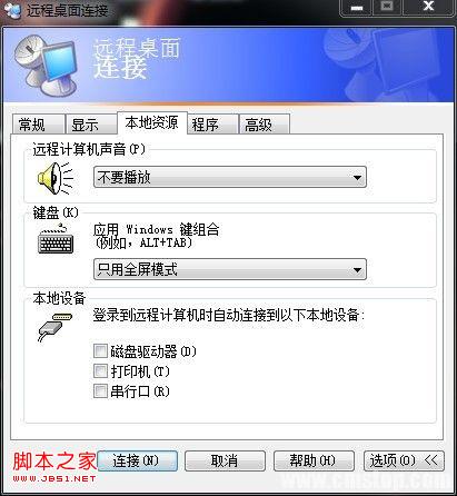 本地资源选项,远程计算贡声音:不要播放.磁盘驱动器,打印机,串口行,去掉勾.这些普通用户都用不上的.且占资源宽带.