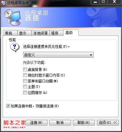 高级选项里边,桌面背景去掉,位图缓存,等全部去掉,如下图.