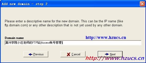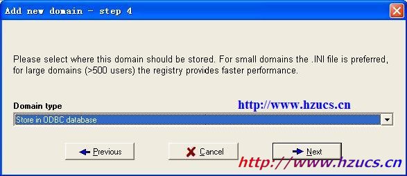 3.成功建立ODBC后,打开Serv-U软件,建立FTP域.在步骤4时注意选择Store in ODBC database