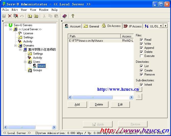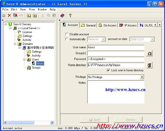 11.此时打开Serv-U,在Users中可以看到刚申请到的hzucs帐户,其主目录为E:\FTP\hzucs.cn.ftp\hzucs