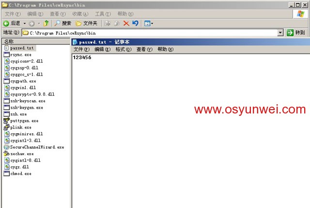 1、打开C:\Program Files\cwRsync\bin目录,新建passwd.txt